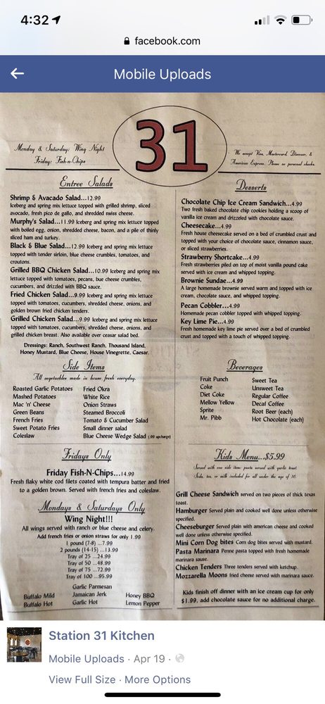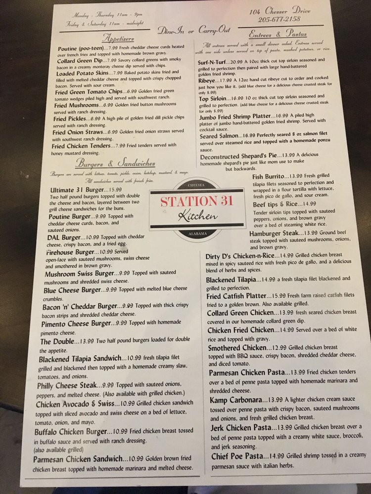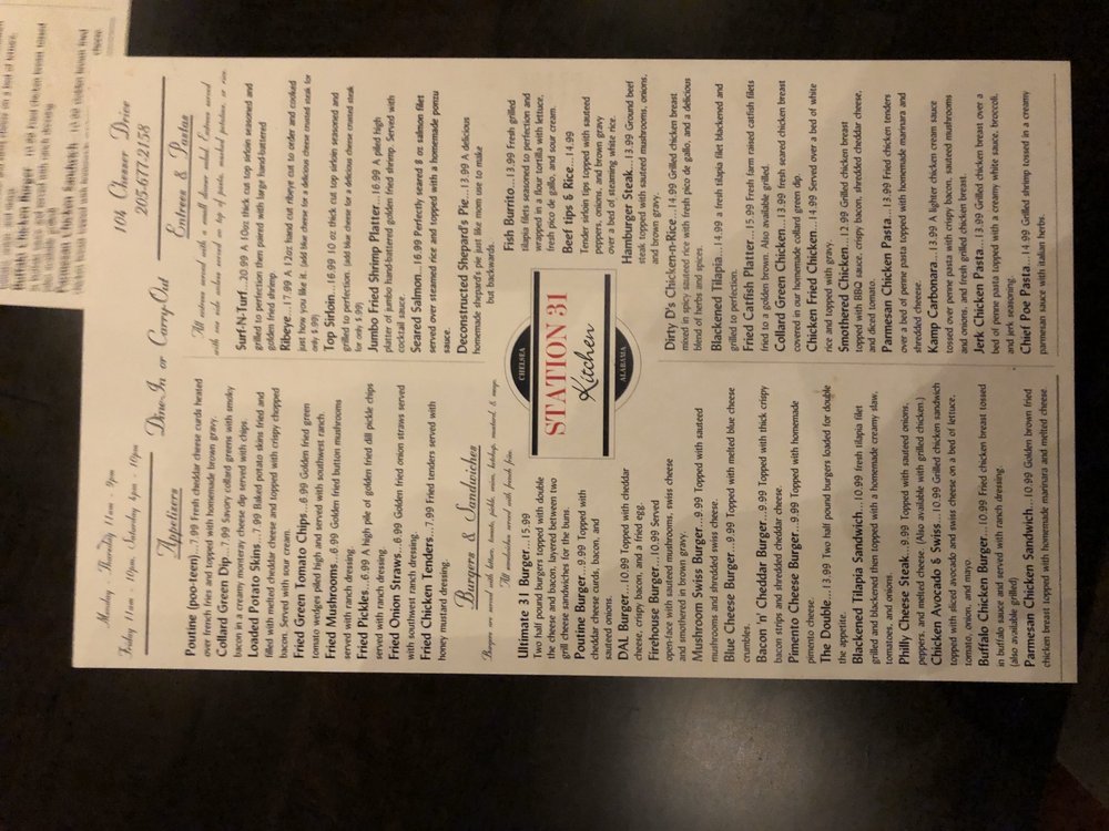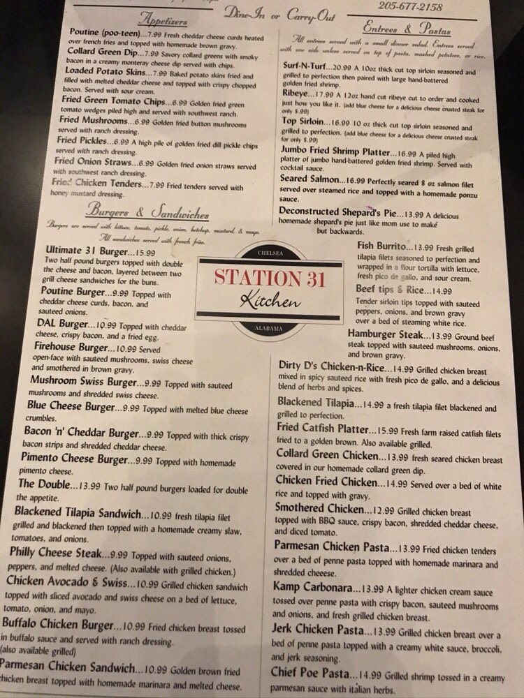Station 31 Kitchen, located in Chelsea, AL, offers a wide range of Southern and American cuisine with a focus on chicken wings. The restaurant provides various amenities such as takeout, delivery, vegetarian options, and even accepts cryptocurrencies. With a casual and trendy atmosphere, Station 31 Kitchen is wheelchair accessible and has outdoor seating for guests to enjoy. Customers have praised the generous portions and speedy service, with dishes like the smothered chicken and a flavorful Surf & Turf earning rave reviews. The staff is friendly and attentive, creating a welcoming environment for diners. If you're looking for a fun dining experience away from the hustle and bustle of Birmingham, Station 31 Kitchen is a must-visit spot for quality food at affordable prices.